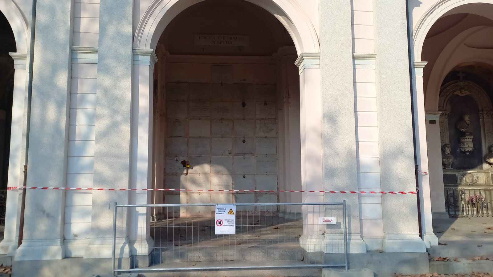 A fine anno, essendosi staccato un rosone dal soffitto, per motivi di sicurezza, l’Ufficio tecnico di AFC (la Società del Comune che gestisce i cimiteri) aveva chiuso al pubblico temporaneamente 11 arcate in Prima e Seconda Ampliazione. A seguito di ulteriori controlli le volte non accessibili sono salite a 23 e transennate anche le aree adiacenti. In attesa della relazione dell’ingegnere strutturista incaricato di valutarne le condizioni e gli interventi da intraprendere, per cautela, tutte le aree coinvolte rimarranno non accessibili ai visitatori. Le famiglie con le Tombe storiche presenti nelle arcate, potranno comunque recarsi in visita ai propri cari in quanto le sepolture sono ospitate nei sotterranei. Come era consuetudine all’epoca, la parte superiore esterna sotto le volte con le targhe e i dati delle persone defunte, era dedicata alle cerimonie commemorative e agli omaggi floreali, mentre le salme venivano tumulate nei piani inferiori. Nello specifico sono state chiuse le seguenti arcate, in I Ampliazione: n. 7, 15, 23, 35, 51, 63, 71, 79, 87, 103, 111, 119, 127, 139, 147, 155, 167, 175, 183; in II Ampliazione: n. 212, 220, 224, 228. Inoltre sono state transennate le zone adiacenti in attesa di verifica tecnica: E, F,B,B bis, C e D.